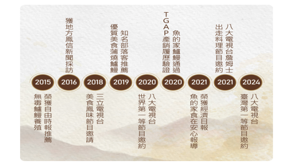 2015年榮獲自由時報推薦無毒鱸鰻養殖。2016年獲地方鳯信新聞採訪。2018年三立電視台美食鳯味節目邀請。2019年知名部落客推薦優質美食蒲燒鱸鰻。2020年八大電視台世界第一等節目邀約。2020年魚的家鱸鰻通過TGAP產銷履歷驗證。2021年榮獲經濟日報魚的家食在安心報導。2021年八大電視台詹姆士出走料理節目邀約。2024年八大電視台臺灣第一等節目邀約。..
